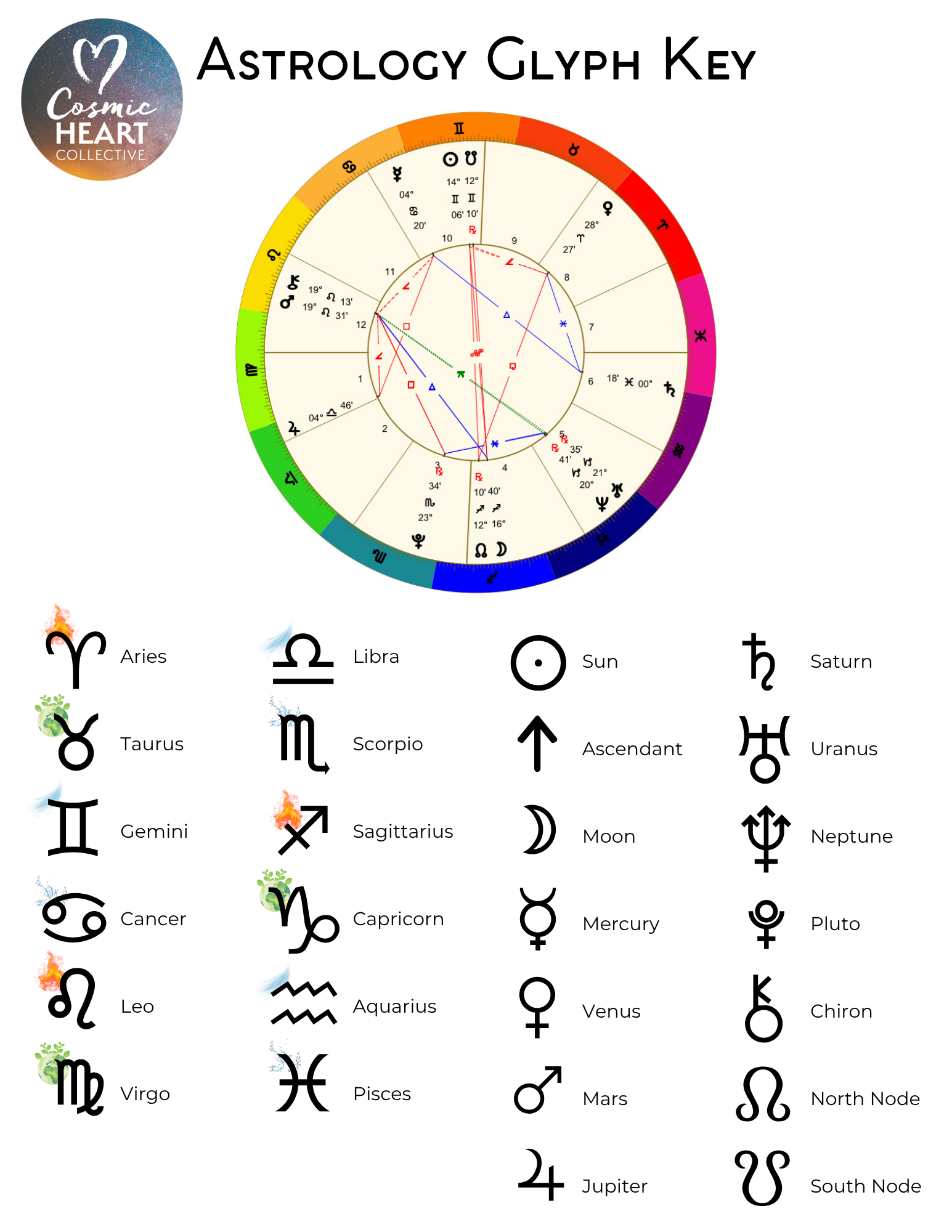 See the Glyph Key below to identify the Zodiac Signs.